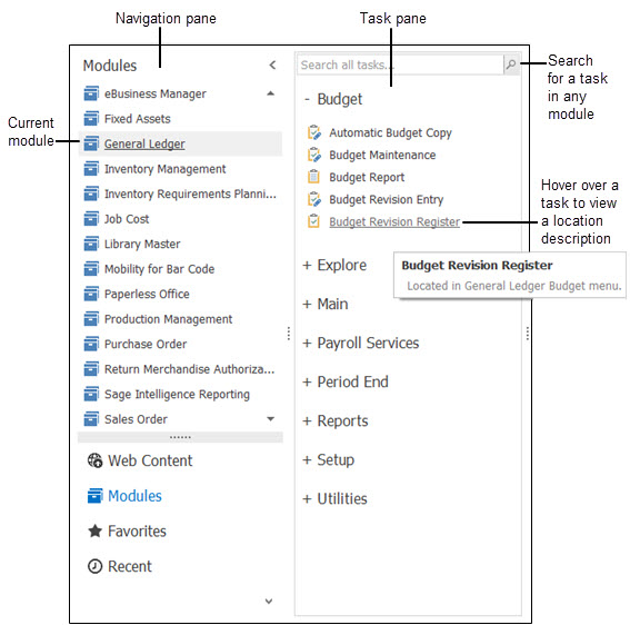Task Pane — The task pane displays the menus for the current module. You can access tasks from the menus and search for tasks from the search field.