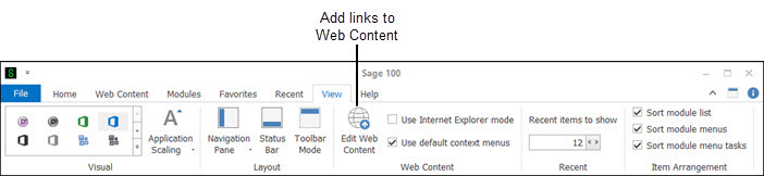 The browser embedded in the Sage 100 Desktop is used to display web pages accessed from the Web Content group, visual process flows, and Sage CRM when started from the ribbon.
